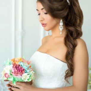 Всё чаще невесты выбирают свадебные причёски с лёгкой небрежностью, оставляя в прошлом сложные высокие причёски с буклями. Чтобы образ выглядел натурально и нежно, лучше всего не перегружать волосы средствами для укладки. Практически под любой свадебный наряд подойдёт классическая причёска – воздушные, аккуратно уложенные крупные локоны. А чтобы не выглядеть слишком строго, волосы можно украсить яркими живыми цветами, оригинальным венком или выпустить несколько прядей.